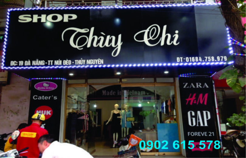 Biển hiệu salon tóc Thùy Chi dùng Alu chữ nổi mica trên có đèn chiếu sáng