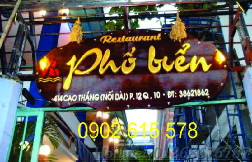 Biển nhà hàng chử nổi gắn trên mặt gổ nhìn đẹp và rất cổ điển